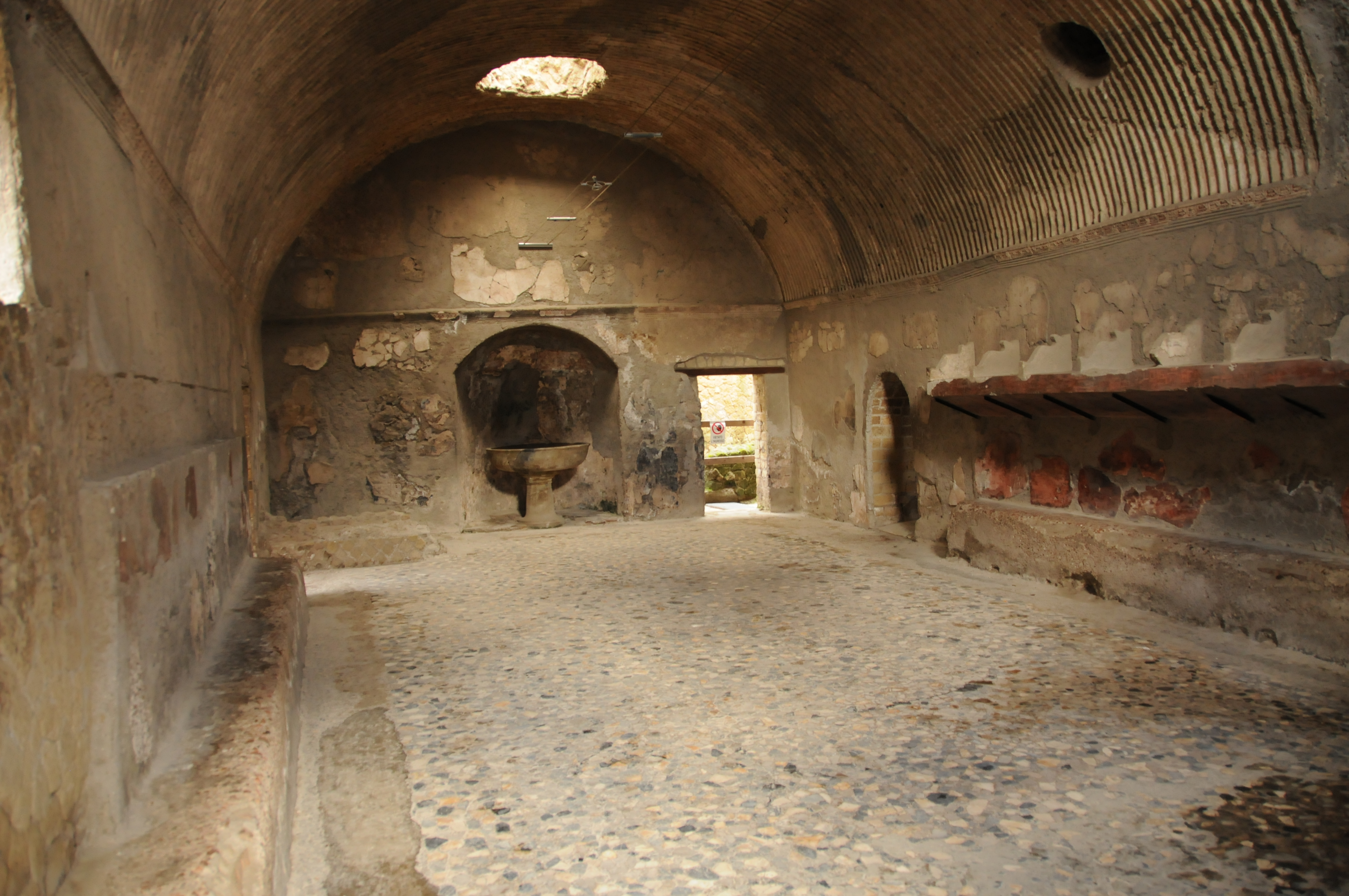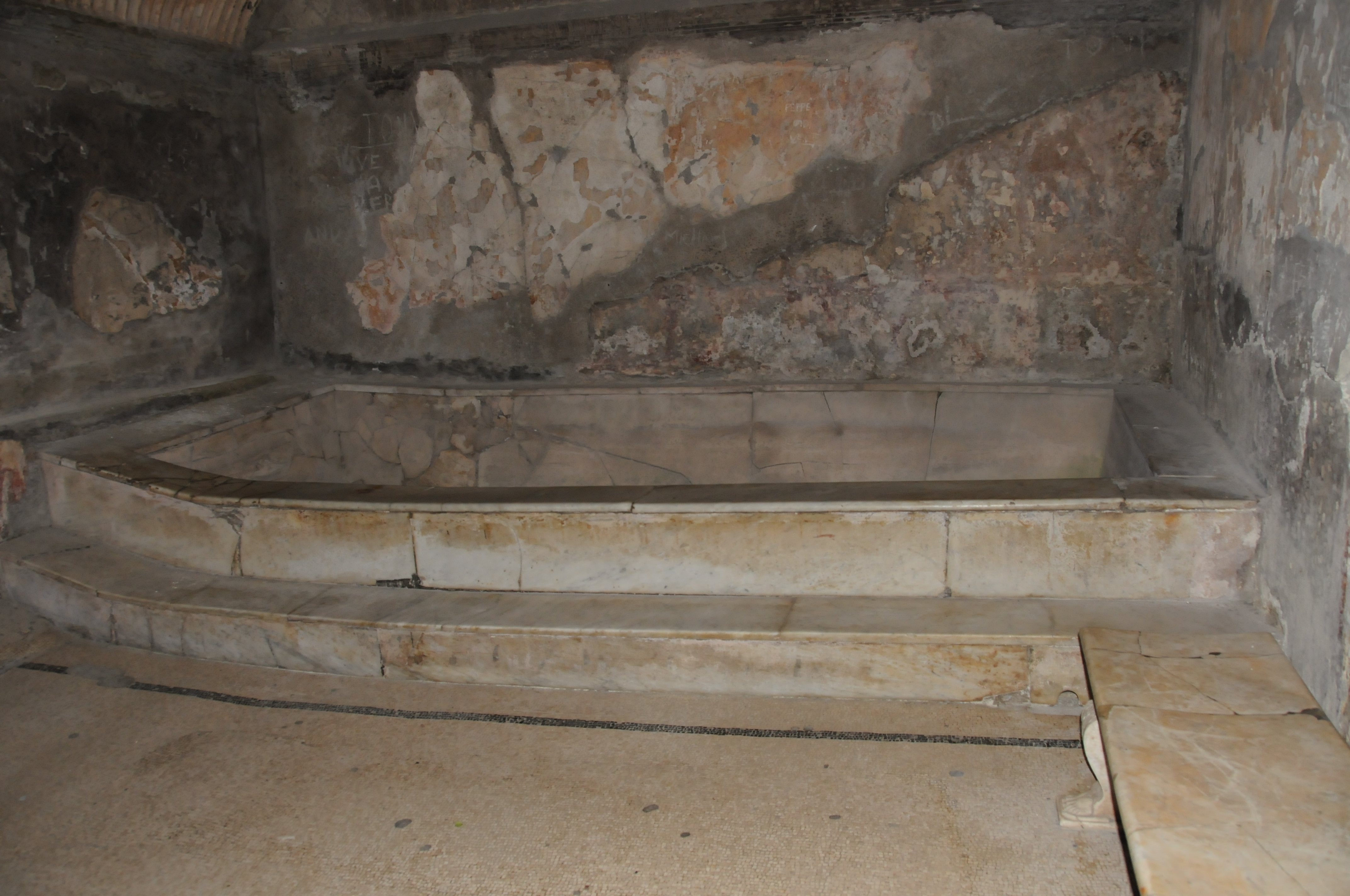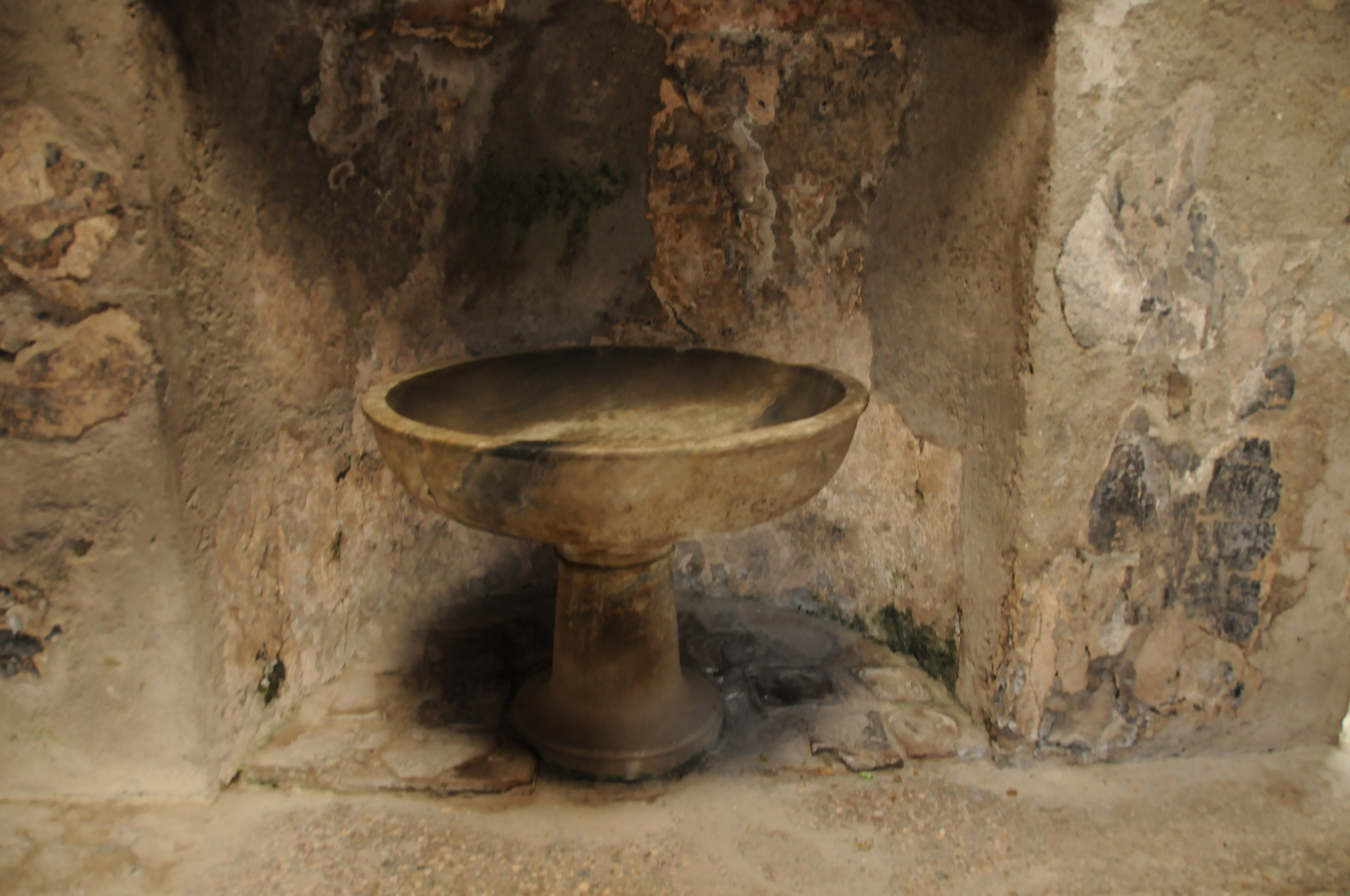 View of men’s waiting room at the Forum baths. Basin at in the back on the left side is for washing feet and the round marble basin is for washing hands.