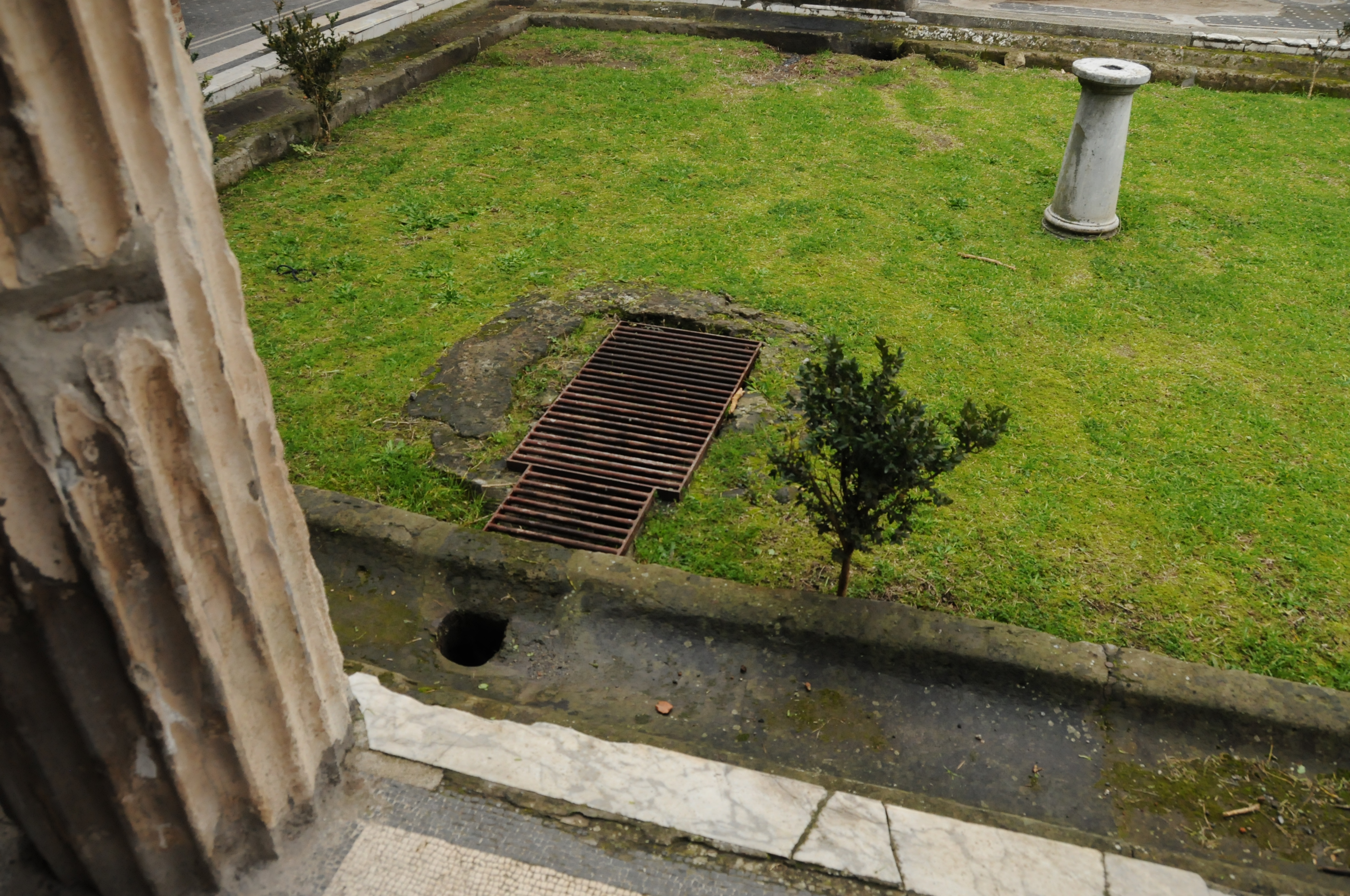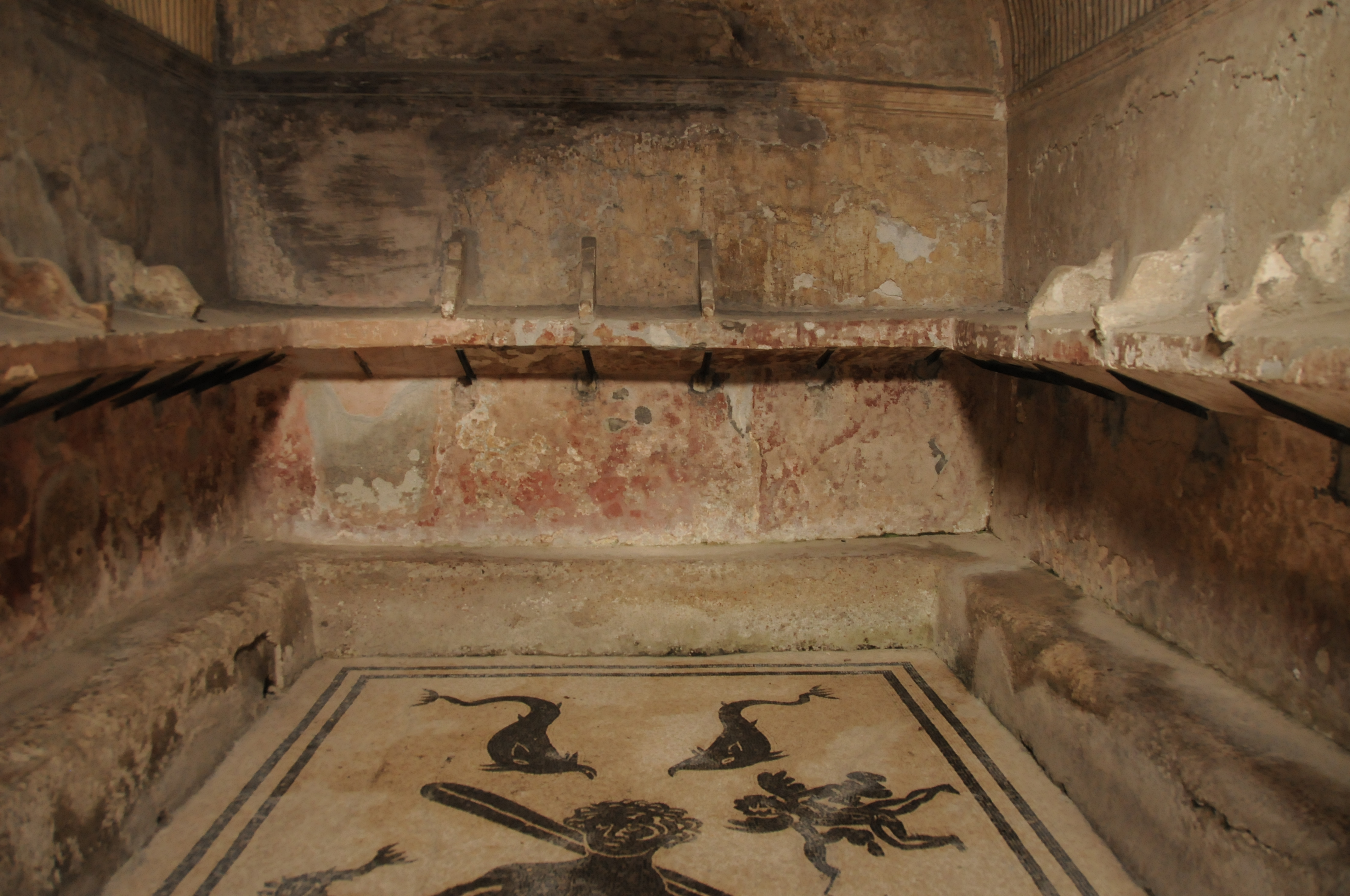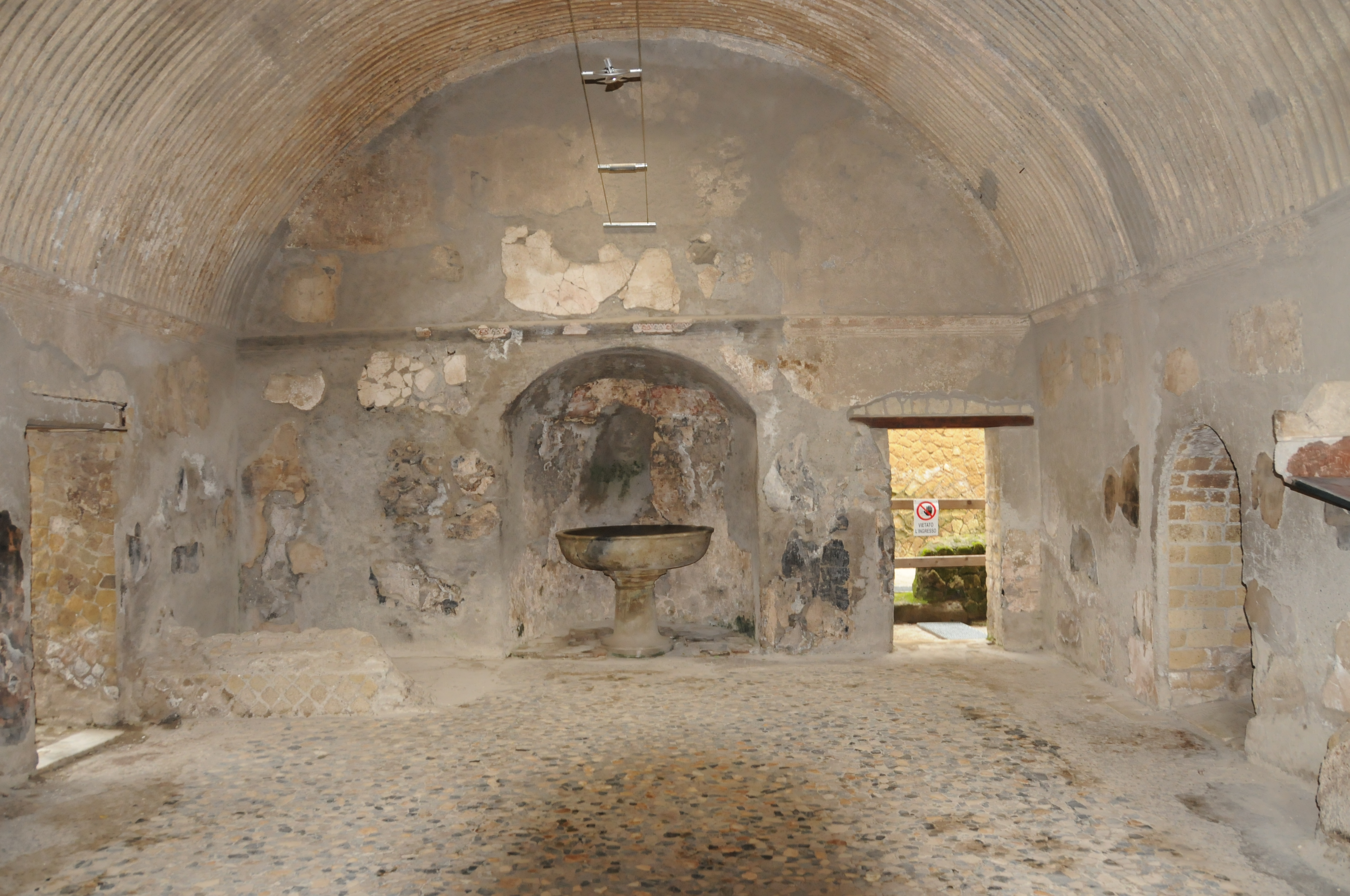 View of men’s waiting room at the Forum baths. Basin at in the back on the left side is for washing feet and the round marble basin is for washing hands.