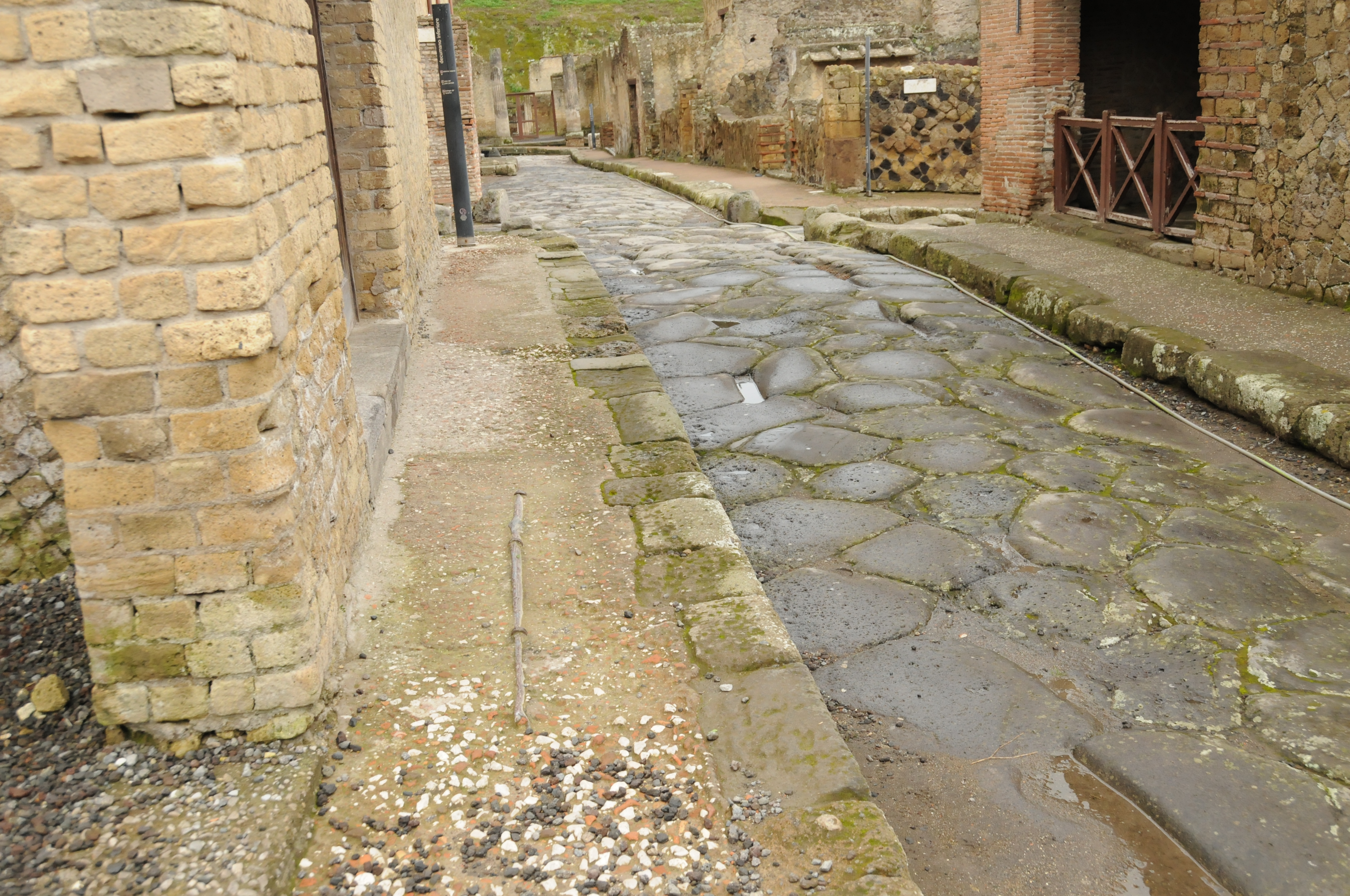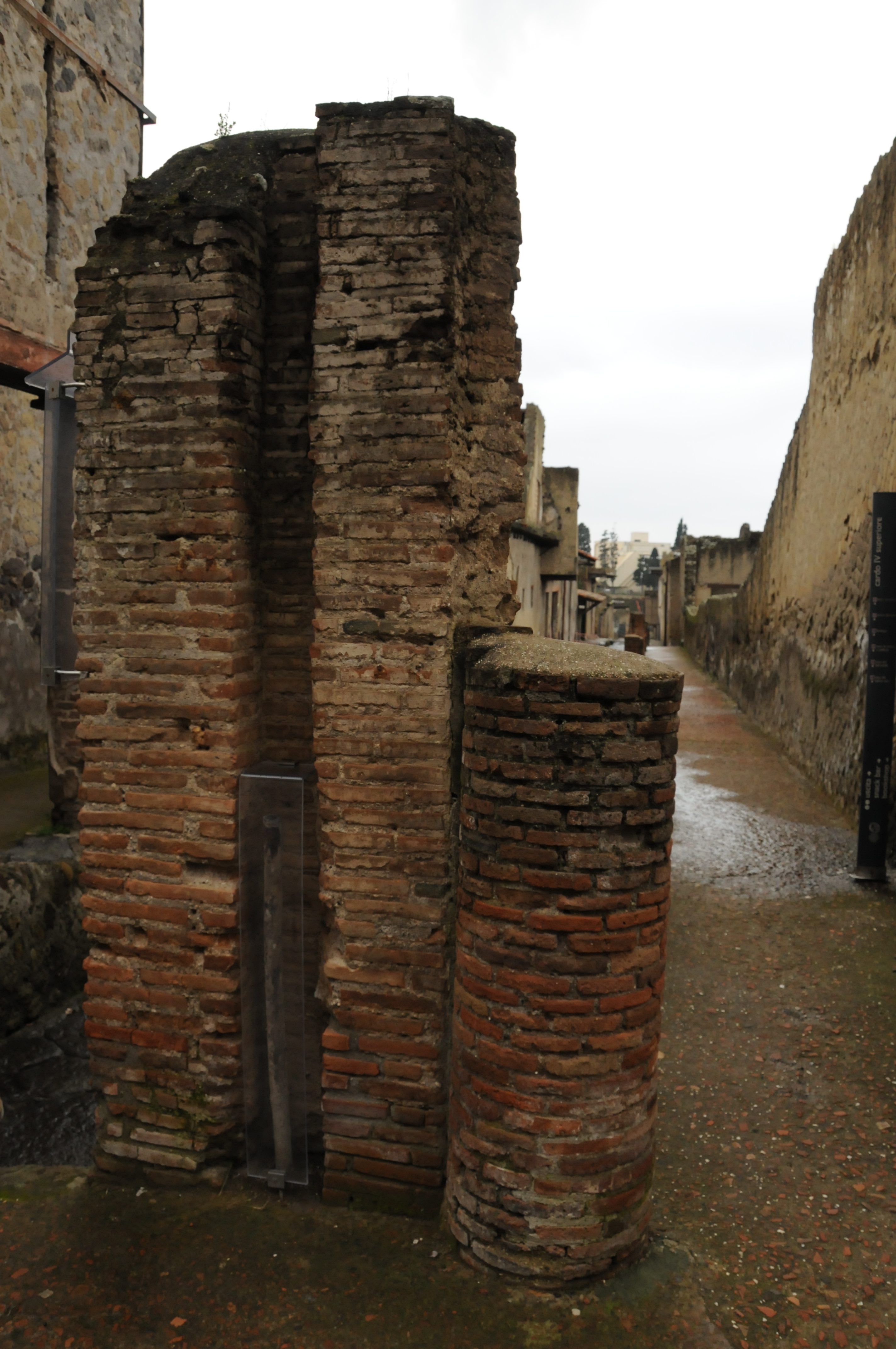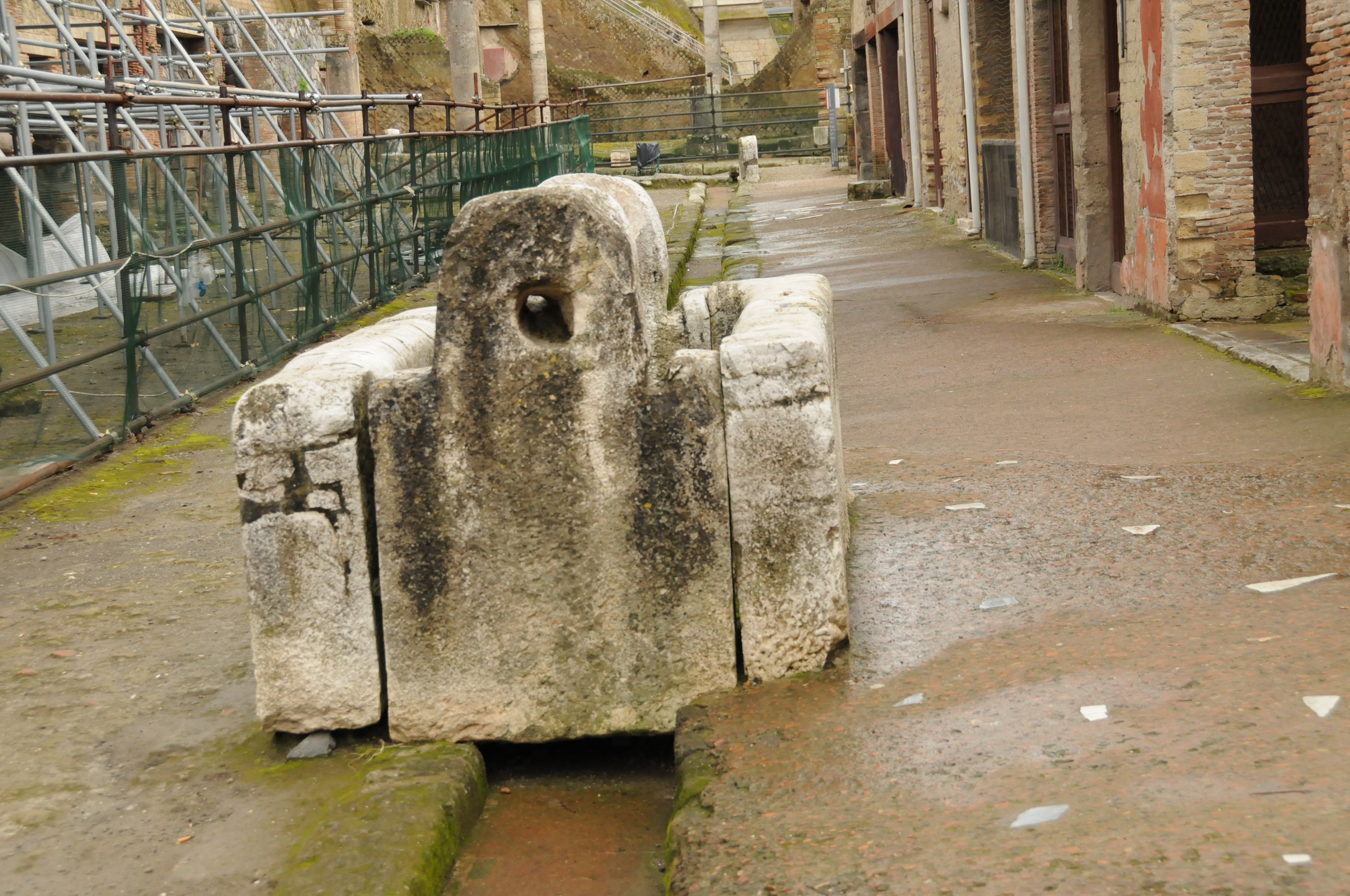 On left side of street is a secondary castellum with adjacent fountain. Lead tank was located on top of the column which was supplied with water from the lead pipes that were located in the indented area of the colmun.